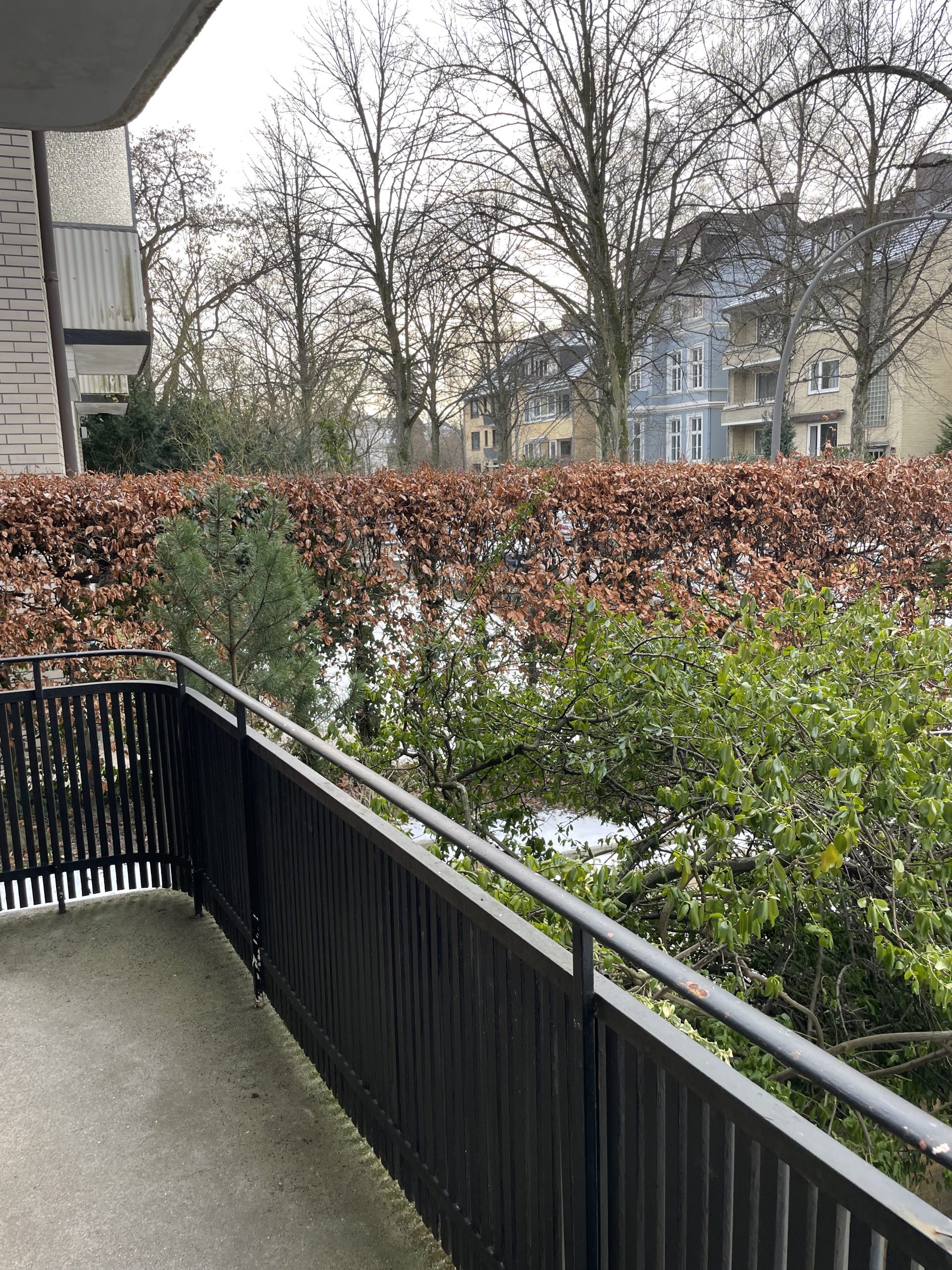 Ein geräumiger Balkon ist in der gesamten Länge des Wohnzimmers aus nach hinten ausgerichtet und bietet einen Blick in den schönen weitläufigen Allgemeingarten.